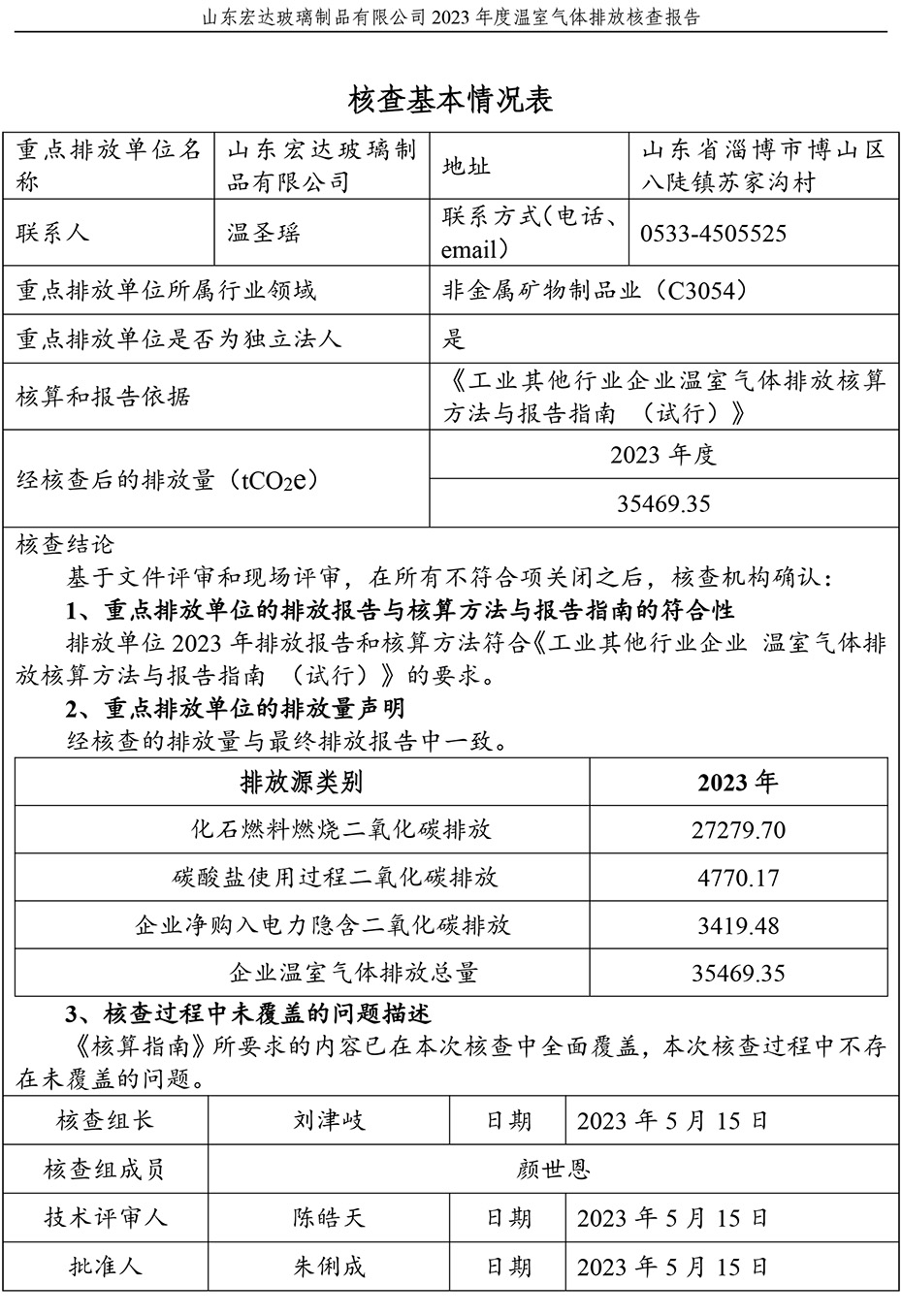 山東宏達玻璃制品有限公司2023年度溫室氣體排放核查報告